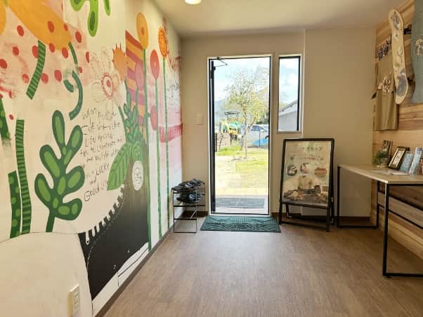 暖かな色の大きなウォールペイントがあります。
